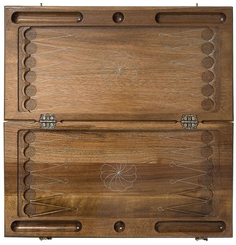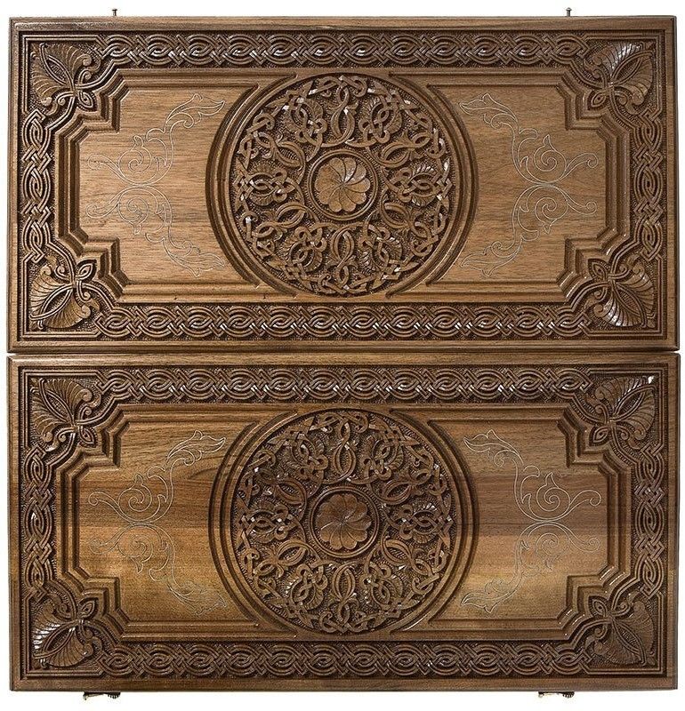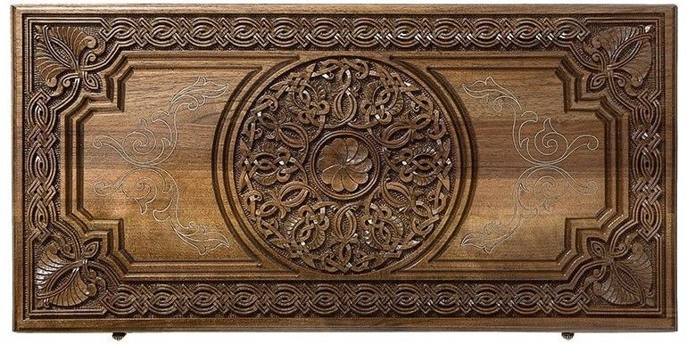 Те, кто ценит в игровых поверхностях не только практичность, но и хочет с их помощью показать собственный высокий статус, обязательно должны обратить внимание на этот экземпляр. Нарды резные Армянский узор с серебром изготавливаются полностью вручную, причем с максимальным вниманием даже к мельчайшим деталям. Делает это собственноручно мастер Карен Халеян, чье имя известно не только в родной Армении, но и в Европе. Материалом для доски служит прочный и долговечный орех, который гарантирует более 10 лет постоянной эксплуатации. Про внешнее оформление можно говорить очень долго, ведь здесь оно выполнено настолько интересно и своеобразно, как будто доску забрали у какого-нибудь шаха, императора или царя.