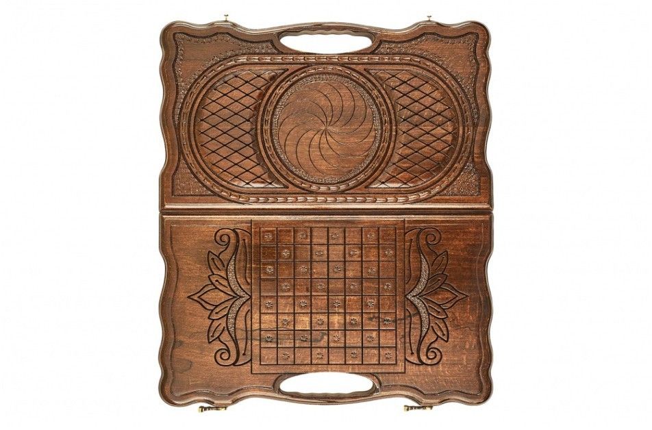 Дерево покрывается лаком, что не только улучшает технические характеристики, но и придает блеска. Нарды резные Бесконечность украшены изысканным узором, нанесенным с обеих сторон доски. В середине находится круг, разделенный на сектора, и когда смотришь на них, впадаешь в некое подобие гипноза, будто наблюдаешь за течение воды или горением огня. Все выполнено очень детализировано и даже если придираться, вы не найдете каких-либо изъянов.