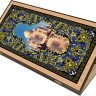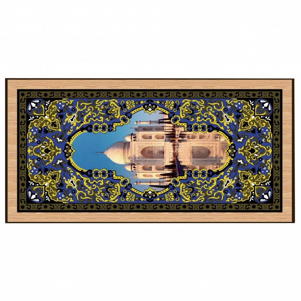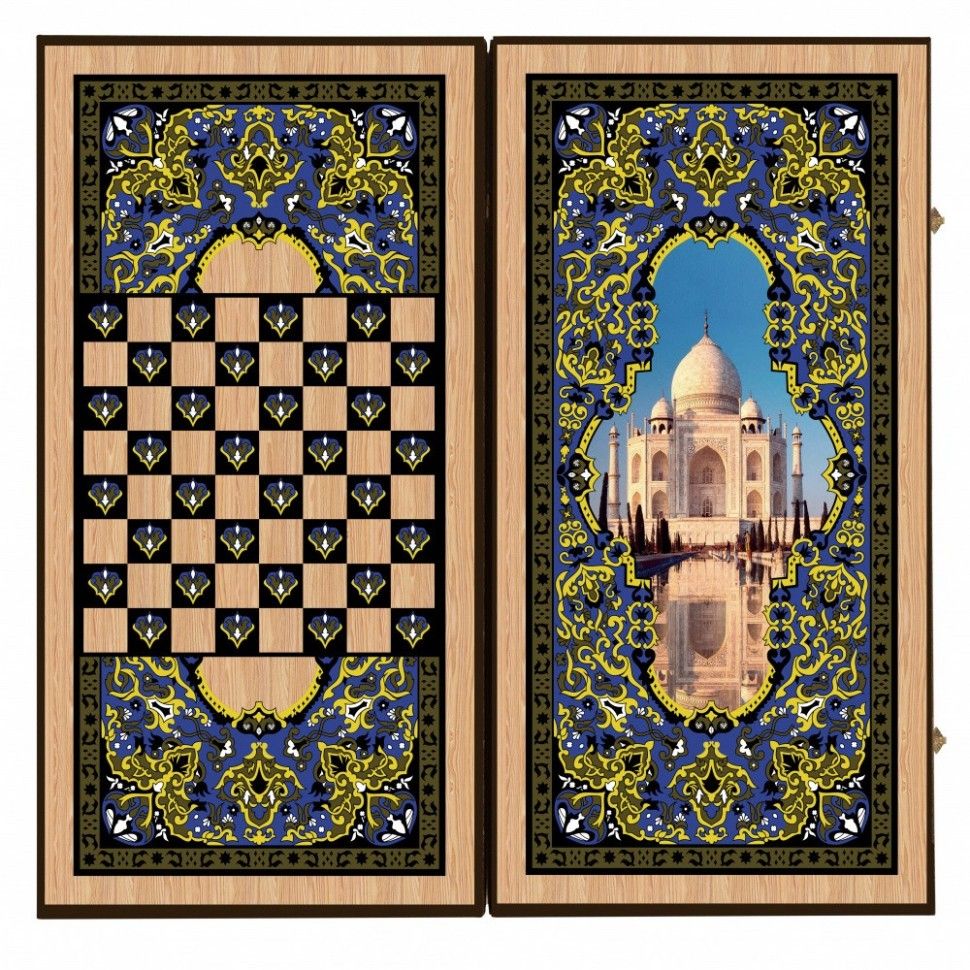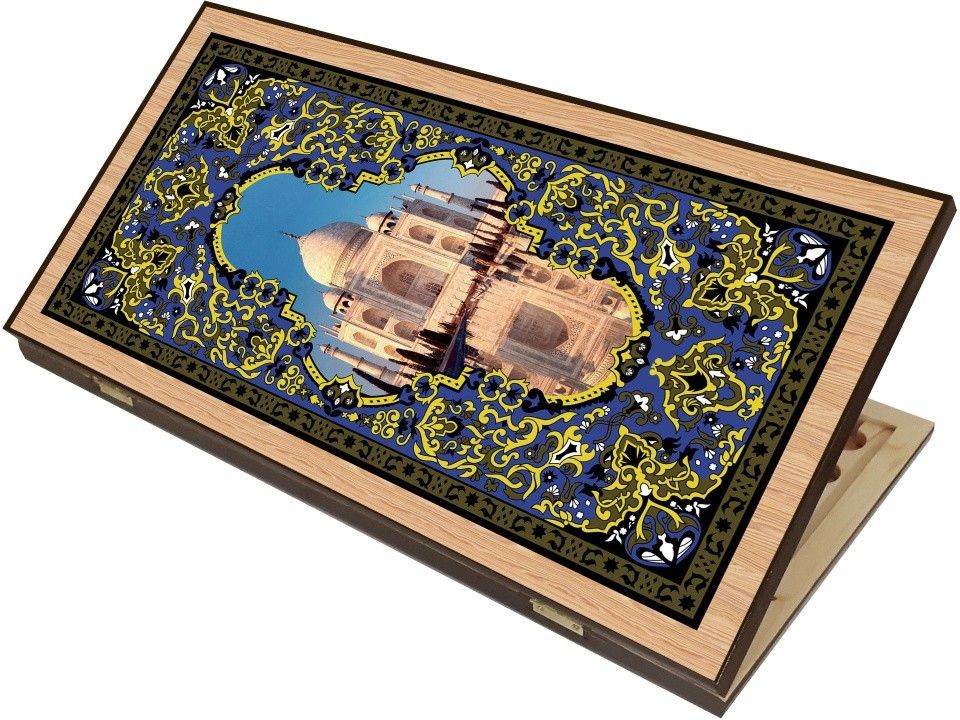 • У нас можно приобрести двойной набор для игры в шашки и большие нарды «Тадж-Махал». Эти комплекты производит российская компания. Предлагаемый набор имеет эффектный и неповторимый внешний вид, а также отличается высоким качеством. Это действительно хороший пример декоративно-прикладного искусства. Внешняя поверхность крышки содержит полноцветное изображение знаменитого индийского мавзолея, отражающегося в водах пруда. Этот принт окружен красочным орнаментом. На другой створке на фоне такого же узора размещено поле для игры в шашки, а внутренняя поверхность короба размечена для нардов. Все изображения нанесены на дерево методом шелкографии.