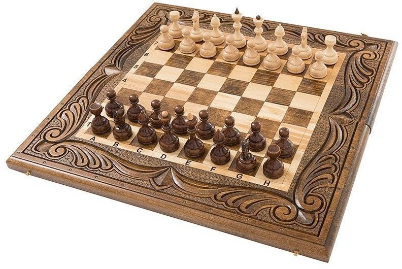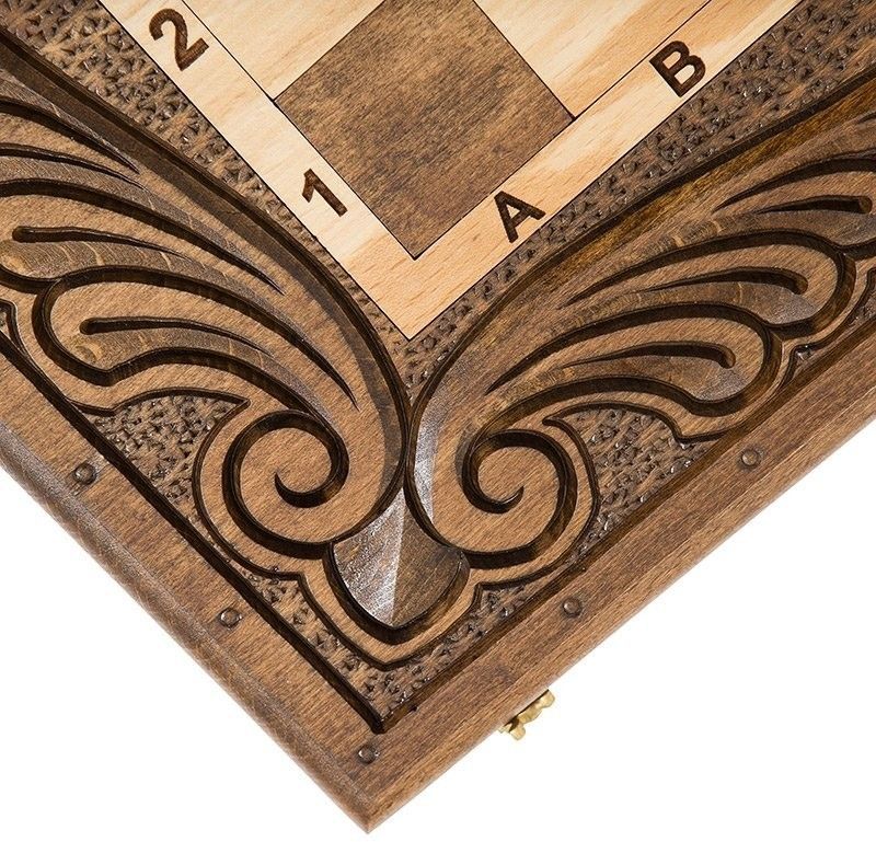 Для украшения, тут выполняется ручная резьба, причем с обеих сторон. На обратной стороне, где находится поле для нард, имеется геометрический рисунок в центральной части, а от каждой ячейки отходят светлые удлиненные капли. Лицевая поверхность служит для шахмат и шашек.