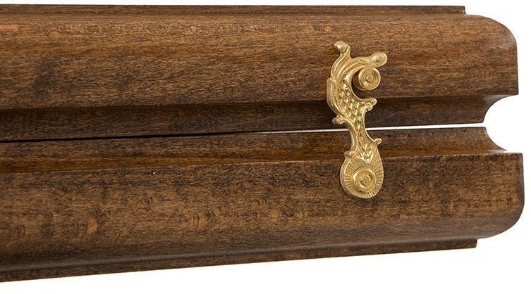 Производитель позаботился, чтобы человек, купивший его изделие, остался доволен на долгое время. Этому способствует использование цельного массива дуба, из которого вырезаются обе створки. Данная древесина достаточно прочная, чтобы выдержать небольшие удары, а к тому же долговечная, особенно при аккуратном обращении. Сверху наносятся несколько слоев лака, что улучшает характеристики, позволяет отталкивать воду и делает внешний вид более привлекательным. Петли и крючки делаются из чистой бронзы, благодаря чему могут прослужить очень долгое время.
